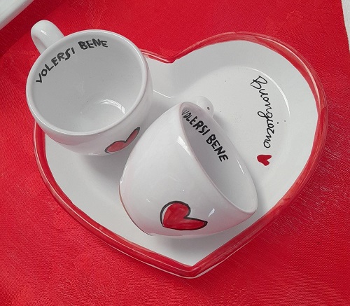- set di n. 2 tazzine da caffè con vassoio a forma di cuore smaltato rosso o bianco con cuori.